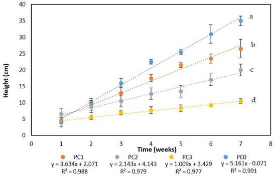 Measurements of the height (cm) of Cannabis sativa L. during the phytoremediation of PAH- and Cu-contaminated soil (PC1, PC2, and PC3 conditions) and the unspiked control. Values are the means of three replicate analyses. The error bars display the RSD (residual standard deviations). The means are interpolated with linear regressions, which are described by equations and determination coefficients (R2) on the graph. The same letter represents no significant differences (p > 0.05) between the reached height at the end of the experiment.
