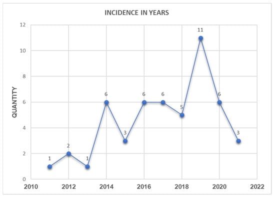 Temporal evolution of publications related to the LCA for timber waste management, from 2011 to 2021.