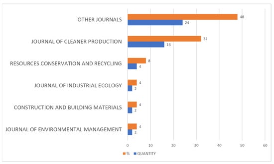 Figure 2 shows the evolution of research over a decade. The year with the most published studies was 2019, and the journal with the highest incidence of articles in the studied area was the Journal of Cleaner Production (32%), which published four times as many studies than the second-place journal (Figure 3).