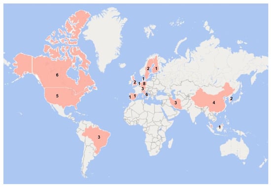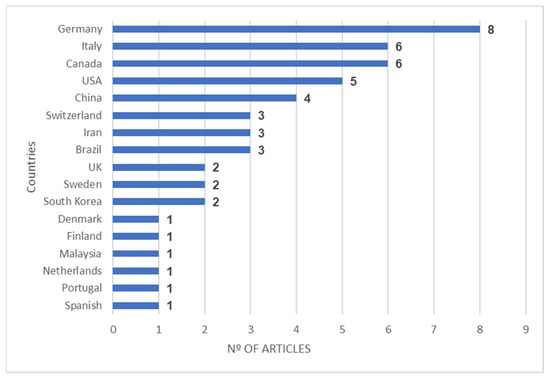 Germany (8), Canada (6), Italy (6), and the United States (5) were the countries with the highest number of publications in the field (Figure 4). There are many countries that are still underrepresented in relation to the number of published papers.