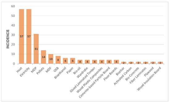The use of wood waste for energy production and product manufacture can contribute to the replacement of fossil fuels and carbon storage, respectively []. Figure 6 shows that heat and electricity, both consisting of 57% of the studies, were the most studied applications. In relation to wood products, MDP was the most investigated (31%), followed by pellet fuels (14%), MDF (10%), and OSB (8%). The number of studies that focused on MDP is justified by the product’s capacity with respect to incorporating waste material while maintaining mechanical properties similar to the particleboards produced with virgin wood. However, other materials with great potential, such as soundproof boards, hydraulic tiles, and ceramic materials, are still little explored or have not yet been an object of study, which opens the field for further studies regarding LCA.