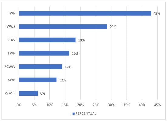 Origin of wood waste considered in LCA studies, from 49 selected studies. Note: WWS—Wood waste from sawmills; PCWW—Post-consumer wood waste; WWFF—Wood waste from furniture factory; IWR—Industrial wood residues; FWR—Forest wood residues; CDW—Construction and demolition waste; AWR—Agricultural wood residues. The nomenclatures have been presented as they appeared in the surveys and some authors considered certain wood wastes to originate from more than one source.