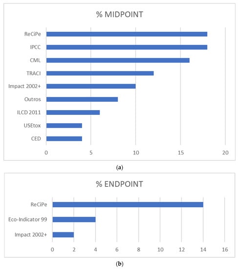 Figure 8 shows the LCIA methods adopted in the LCA research applied to the use of wood waste, and it is possible to verify that the ReCiPe (18%) and IPCC (18%) methods were the most used within the midpoint categories (Figure 8a). While IPCC enables analysis of only one category, ReCiPe enables extensive analysis by uniting midpoint and endpoint approaches into a single structure. ReCiPe was created from Eco-indicator 99 and CML 2000, with global applications for the categories of the impact of climate change, the destruction of the ozone layer, and the consumption of resources. In the group of articles that used endpoint categories (Figure 8b), ReCiPe also stood out, and was adopted by 14% of the 49 studies reviewed. Within the midpoint approach, CML (16%) and TRACI (12%) stand out. The first has a more global scope of application while the second is based on the conditions of the United States.