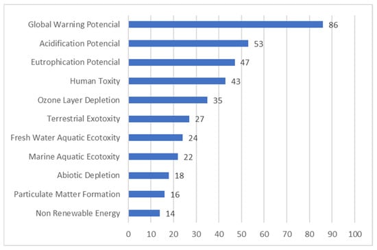 Midpoint categories were used in 70% of the studies, while endpoints were adopted by 2% [] and 16% used both categories. However, about 12% of the analyzed articles did not explain the method used to reach the result of the indicator presented. Figure 9 shows that 86% of the studies analyzed the category of “global warming.” Subsequently, “acidification,” representing 53%; “eutrophication,” representing 47%; and “human toxicity,” representing 43% also showed relevance. Most of the research in the forestry sector analyzed impacts considering the indicator for Global Warming Potential (GWP), since the resources of wood are basically constituted by biogenic carbon [,].