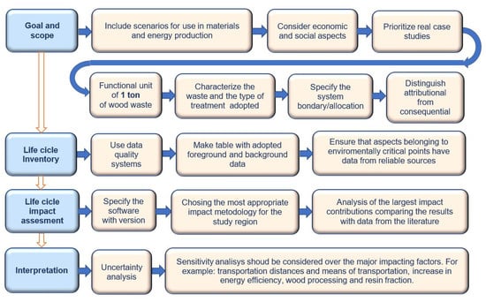 Thus, in order for researchers to take a first step in this direction, to assist future studies of environmental performance, a guideline proposal (Figure 10) was presented, which shows the main points to be considered for the performance of better LCA. Although there is still a great deal of progress yet to be made, this initiative aims to contribute information such that new research in this area can be better compared between scenarios and improved in relation to the consistency of results. Additionally, in the near future, this article also has the potential to contribute to a possible draft standard to be developed specifically for LCA studies on the environmental performance of wood waste management systems.
