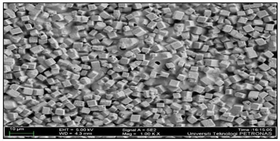 The surface morphology of the resulting CM is shown in Figure 2. Referring to Figure 2, it was observed that the surface of the membrane is filled with considerably fewer aggregate clusters of SAPO-34 fillers. In addition, The FESEM image of the membranes also reveals that the membranes were successfully fabricated without significant interface defects such as voids, agglomeration, or non-uniformity of the membrane structure. Moreover, no observation of visible pores is detected in this image.