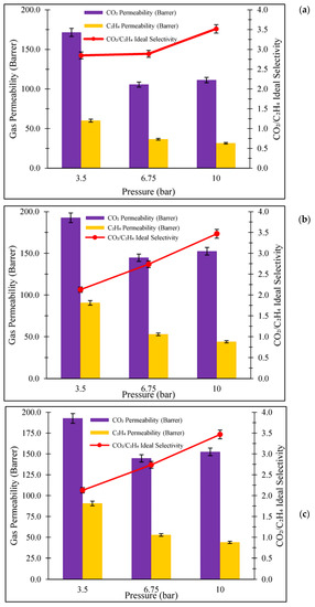 The resultant CM was tested for gas separation performance by using gas permeation equipment. The permeability and selectivity of the membranes were measured at temperatures ranging from 25 °C to 60 °C and pressures of 3.5 to 10.0 bars, respectively. The permeation of CO2 and C2H4 gases was determined using a gas permeation test apparatus as disclosed in the literature [19]. A bubble flow meter connected to a permeate line was used to check the flow rate of gas. The permeability, P of the membrane was determined by using Equation (1) as follows [20]: