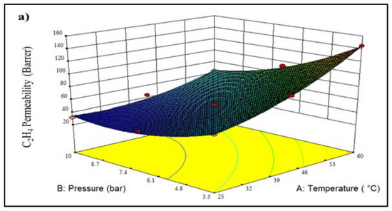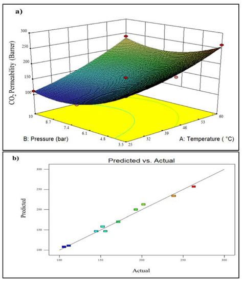 Figure 5a displays a 3D plot of the effect of various operating conditions on CO2 permeability. As seen in Figure 5a, increasing the temperature at a feed pressure of 3.5 bar resulted in increased CO2 permeability of about 34.7% (from 171.5 Barrer to 262.86 Barrer). This might be owing to increased CO2 diffusivity due to increased polymer chain mobility and free volume [26,27]. Meanwhile, increasing the pressure from 3.5 bar to 6.75 bar at 25 °C resulted in a reduction of CO2 permeability (62.3%) due to the continual saturation of CO2 gas inside polymer macro voids [28]. Furthermore, the CO2 decrease may be attributed to lower fractional free volume (FFV) as a result of some reductions in transport routes [29]. However, the increment of feed pressure from 6.75 to 10.0 bar resulted in an enhancement of CO2 permeability from 105.68 Barrer to 111.34 Barrer, indicating higher gas solubility [29]. The highest CO2 permeability of 262.86 Barrer was reached at a temperature of 60 °C and a pressure of 3.5 bar. Meanwhile, the lowest CO2 permeability of 105.68 Barrer was reached at 35 °C and 6.75 bar pressure. The parity plot for CO2 permeability is depicted in Figure 4b, showing that the actual and anticipated response values are dotted in close proximity to the 95% prediction range.