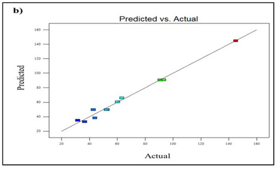 The statistically significant correlation of the operational parameters and interactions was evaluated using the fitted model’s F-value and p-value for each response. The F-value is defined as the ratio of the mean square (MS) model and error. The MS model can be calculated by dividing the total squares by the df value. The p-value reflects the significance of the model, with a value of 0.05 indicating that the regression model is relevant and the null hypothesis (Ho): p 0.5 being rejected. Additionally, the consistency of the models was assessed using the coefficient of determination (R2). The uncertainty that the fitted model cannot explain is known as the residual. In addition, the term “lack of fit” indicates that the lack of fit is negligible compared to pure error.