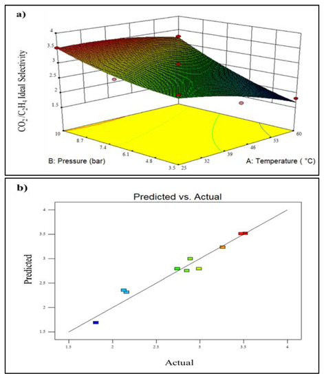Plot of (a) 3D model of CO2/C2H4 ideal selectivity for temperature vs. pressure, and (b) predicted vs. actual CO2/C2H4 ideal selectivity (A lighter colour (blue) denotes lower membrane performance, whereas a darker colour (red) shows higher membrane performance.).