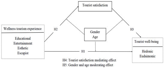 There are also some differences in the needs, preferences, experience satisfaction, and consumption behavior of tourists of different ages [119,120,121]. For example, Assaker et al. [122] found that age influences tourists’ behavioral intention and satisfaction and plays a significant moderating role among destination attraction, accessibility, and tourist satisfaction [41]. According to Rather and Hollebeek [121], visitors younger than 39 years of age are more concerned with participatory experiences and stronger self-awareness, whereas older visitors are the opposite. Compared with young customers, older consumers pay more attention to producing value [123], have higher brand loyalty [124,125], place greater emphasis on good experiences [126], and are more resistant to new technological experiences in tourism products [127]. While studies on well-being continue, no study in the field of wellness tourism has yet explored whether gender and age have a significant role in promoting tourists’ well-being. Thus, to explore the role of gender and age on the wellness tourism experience, tourist satisfaction, and tourist well-being, the following hypothesis is proposed:
