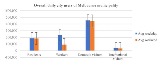 - City of Melbourne. (2019). Daily Population Estimates Summary Report 2019. Available online: https://www.melbourne.vic.gov.au/SiteCollectionDocuments/daily-population-estimates-summary-2019.pdf (accessed on 16 December 2022).