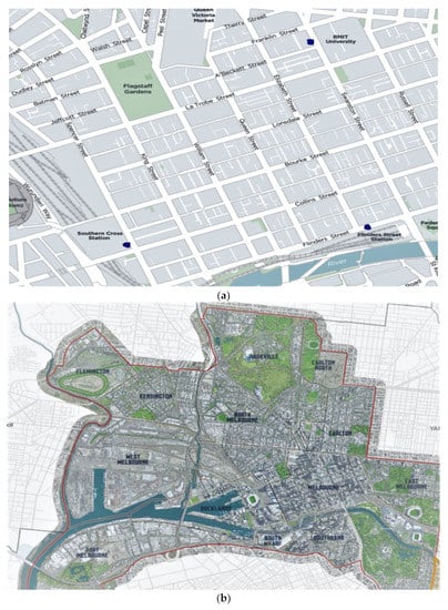 (a) Pedestrian survey locations marked in blue colour [37]. (b) Map of Melbourne Central Business District [37].