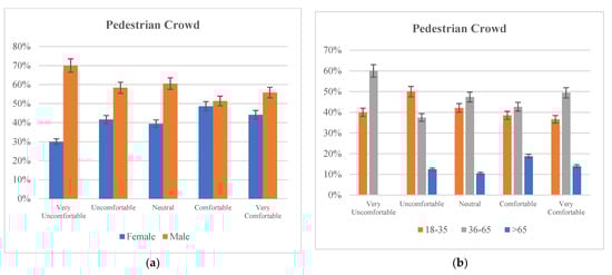 Pedestrians have also noticed this change with the overall decrease in pedestrian volume in the Melbourne CBD. As a result, overall comfort levels are maintainable, with 85% of pedestrians stating that they felt either comfortable or very comfortable with the pedestrian crowd around them. As stated in the Transport for London (2010) [32] analysis, having a pedestrian sidewalk that is conducive to the demands of pedestrians such that they feel comfortable and can support the demand during peak periods is extremely important for the PLOS. Having pedestrians perceive a state of comfort due to personal privacy and not being invaded by other pedestrians is one of the main contributors to the PLOS model. It can influence how pedestrians perceive other factors. These findings were similarly supported in a study performed by Choi et al. (2014) [38], where a similar analysis was conducted in the streets of Seoul, Korea. Their study further contended that there was a strong relationship between pedestrian comfort and the overall flow rate, density, and conflict with other pedestrians. Figure 3a shows that male pedestrians experienced a high comfort during COVID-19 compared to females and elderly pedestrians. This could be understood from the data in Table 2, which shows that 47% of the pedestrians felt ‘comfortable’ and 38% of the pedestrians felt ‘very comfortable’ with the pedestrian crowd around them. Hence for ratings 4 and 5, we find the percentage of male responses to be higher compared to females, and elderly pedestrians’ response percentage to be lower than other age groups as shown in Figure 3b.