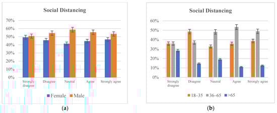(a) Gender distribution of responses for social distancing (b) Age distribution of responses for social distancing.