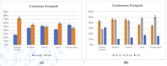 Based on the accumulated responses, it was found that male pedestrians were not happy with the continuity of footpaths as a higher percentage of them strongly disagree and a lesser percentage of them strongly agree to the availability of continuous footpaths on both sides of the street in the CBD as shown in Figure 5a. It was also evident that the elderly pedestrians were affected due to the discontinuity of footpaths as lesser percentages of them agree to the presence of continuous footpaths on both sides as shown in Figure 5b.