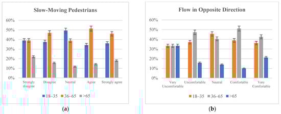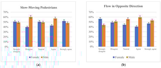 Based on the data collected, between the male and female pedestrians, the male pedestrians seem to agree more to the condition that flow of pedestrians is favorable for a good walking environment, than the female pedestrians as shown in Figure 7a,b. Trends could be analysed with middle-aged pedestrians favouring a more positive response with respect to the flow of pedestrians than other age demographics, as shown in Figure 8a,b. This may be partly due to middle-aged males having a higher average walking and crossing speed than females, followed by a younger demographic and the elderly [40]. As a result, the middle-aged males are less impacted by the fast flow of pedestrians on either direction whereas the females and elderly pedestrians who have less walking speed seem to be disturbed by the pedestrians coming from opposite direction and slow-moving pedestrians and phone users obstructing the footpath.