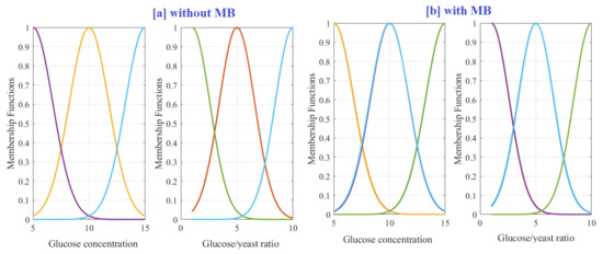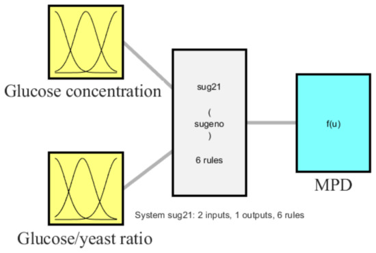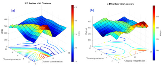 Figure 5 showed the three-dimension surface of the fuzzy model of the influence glucose concentration and glucose/yeast ratios on MPD of air cathode MFC with and without MB. The MPD increased by increasing the glucose concentration until a certain concentration (9.13 mg/mL), then MPD decreased with further increase. As the available amount of glucose is enough for the growth (reproduction) of all the available yeast cells, the further increase in the glucose will not affect the MPD. However, at higher glucose concentrations, the performance could be decreased due to the decrease in the anolyte conductivity by glucose (nonconductive) [34]. Furthermore, the increasing amount of glucose in the anode chamber could inhibit the yeast growth and rebate the yeast metabolism and thus the power output [40]. The effect of glucose concentration and glucose/yeast ratio significantly appears in the case of mediator-less MFC. The electron transfer occurs directly through the yeast cells attached to the anode, and the suspended yeast cells in the anolyte have no role in power generation [21,34].