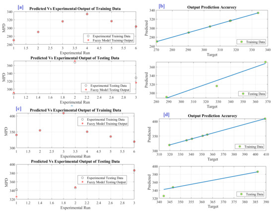 Table 1 shows fuzzy modelling RMSE values of 4.4465 and 5.4206 for without and with MB, respectively. While using RSM [34], the RMSE values are 34.18 and 32.65 for without and with MB. This means the fuzzy modelling method sharply decreased the RMSE values by 87% and 83.4%, respectively, for without and with MB compared with RSM. Regarding the coefficient of determination values, for the model of YMFC without MB, fuzzy lifted the coefficient of determination from 0.86 to 0.9746 compared with ANOVA (lifted by 13.32). Additionally, for the model of YMFC without MB, the coefficient of determination was lifted from 0.89 to 0.9645 with a percentage of 8.37%. This emphasizes the model’s accuracy in tracking data trends. Figure 3 depicts a comparison of the fuzzy model and the measured data. The fuzzy model is compared to the measured data, which indicates the model’s consistency. A critical approach is to investigate the modeling accuracy to ensure the performance of the constructed model for any different data. The constructed model’s prediction is plotted against the dataset in both the training and testing stages to assess prediction accuracy. The plot (Figure 3b,d) demonstrates that the constructed model predictions are dispersed closely over the one hundred percent precision. The fuzzy MFs of inputs are demonstrated in Figure 4. While Figure 5 displays the three-dimensional fuzzy surface of YMFC without MB and with MB, respectively.