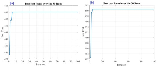 The integration between fuzzy and MPA improved the performance of YMFC in comparison with measure data and RSM. Without MB, the power density increased by 25% and 29.3%, respectively, compared with measured data and RSM. Additionally, with MB, the power density increased by 22.4% and 26%, respectively, compared with measured data and RSM. The optimization results cannot be reliable unless the number of trials has been done. Therefore, the MPA code was implemented 30 times. The maximum objective function found so far over all 30 runs during the optimization process is presented in Figure 6a,b, respectively for without MB and with MB. The detailed variation in the decision variable is also presented in Figure 7a–d, respectively, for glucose concentration without MB, glucose/yeast ratio without MB, glucose concentration with MB and glucose/yeast ratio with MB. Without MB, the glucose concentration and glucose/yeast ratio are 9.13 mg/mL and 1.0, respectively. Under this condition, the MPD is 460.2 mW/m2. Whereas with MB, the glucose concentration and glucose/yeast ratio are 13.06 mg/mL and 1.0, respectively. Under this condition, the MPD is 500.56 mW/m2.