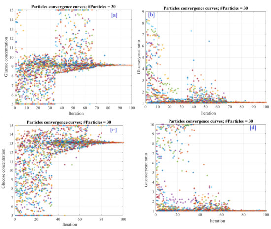 Decision variable variation during the optimization process (a) glucose concentration without MB, (b) glucose/yeast ratio without MB, (c) glucose concentration with MB and (d) glucose/yeast ratio with MB.
