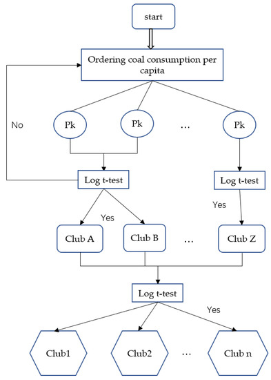 When the null hypothesis of overall convergence in all provinces is rejected, the clustering algorithm proposed by PS can be further used to determine whether there is club convergence, the steps of which are as follows. The club convergence test analysis flow chart is shown in Figure 1.