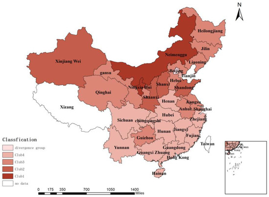 First, according to the log t-test, the 30 Chinese provinces in this study are divided into 4 initial clubs (Club1–Club4) and a divergence group. Among them, the t-statistics of the first 4 initial clubs are all greater than −1.65, indicating that the provinces within each initial club satisfy the convergence hypothesis. Second, the formed clubs are subjected to a merger test to test whether a larger convergent club could be formed. According to the results of the merger test, the t values of all the merger test coefficients are less than the critical values, indicating that none of the initial clubs could be merged. Therefore, it is proven that the initial club is the final convergent club formed. The geographical distribution of the members of these clubs is shown in Figure 2.