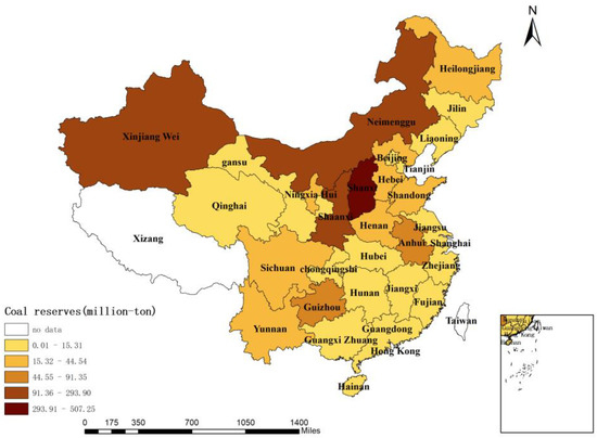 Figure 2 shows that the geographic locations of each club member are mostly distributed together, mainly because the changes in industrialization level, energy reserves, population size and economic level of each province not only affect the coal consumption level of the province but also radiate to other neighboring areas, thus affecting their convergence process. Figure 3 shows the geographic distribution of coal reserves in China; it can be seen that the geographic distribution of coal reserves is not exactly consistent with the geographic distribution of convergence clubs. Regionally, the distribution of Club1 to Club4 roughly follows the northern, central and southern regions of the Chinese map, respectively, with the only divergence group, i.e., Beijing, being in the northern region. Moreover, the economic strengths of each club’s members are not exactly the same, i.e., there are economically developed and relatively economically underdeveloped provinces in Club1, Club2, Club3 and Club4, indicating that the coal-consumption level in each region not only is linked to the level of economic development but also may be related to the energy structure, policies and regulations, geographical location, and environmental governance. A specific analysis of each club is presented below.