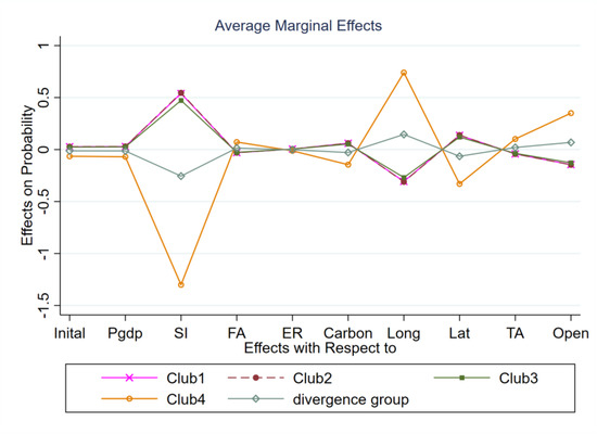 where i represents each province, the dependent variable is the value taken for Club1 to Club5, denotes the estimated coefficients, denotes the explanatory variables, and denotes the disturbance terms. The specific regression results and the marginal effects of each explanatory variable at the mean are shown in Table 4. For a more visual analysis of the variation in the marginal effects of each explanatory variable on the probability of being in a certain club, we plot them graphically in Figure 5.