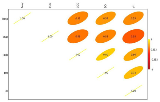 The efficiency of post-slaughter wastewater treatment was tested in a Hybrid Upflow Anaerobic Sludge Blanket Reactor (HUASBR), consisting of polypropylene as a growth surface. During the acclimatisation stage, the amount of real wastewater sludge was gradually increased, while the amount of synthetic wastewater sludge was proportionally reduced in the mixed reactor feeding. The observed total suspended solids removal efficiency was in a range of 72–98% throughout the test [46]. The mechanism of the influence of the new pollutant (diclofenac, DCF) in wastewater on the efficiency of the Enhanced Biological Phosphorus Removal (EBPR) process showed that when the concentration of DCF was 2.0 mg/L, the COD removal efficiency decreased significantly to the level of 71.2 ± 4.2% [47]. The in-situ treated textile wastewater was electrocoagulated for reuse in agricultural irrigation. 18.6% of the COD, 83.5% of turbidity and 64.7% of total suspended solids were obtained [48]. New devices based on the New Integrated Self-Reflux Rotating Biological Contactor (NISRRBC) have been developed for the treatment of rural wastewater. The COD concentrations in wastewater were respectively 15.34 ± 7.29 mg/L. The system created a favourable gradient for microenvironmental conditions and functional flora, thus facilitating the removal of contaminants from the wastewater [49]. Direct anaerobic treatment of domestic wastewater is becoming attractive as it can transform a wastewater treatment plant from energy-consuming to energy-producing. A pilot Anaerobic Sludge Blanket Reactor (UASB) sludge digestion chamber was tested for household wastewater. The results show a stable COD removal efficiency at the level of 60 ± 4.6%, depending on the temperature [50]. An H-type microbial fuel cell (H-MFC) was used to treat used distillery wastewater (DSW), diluted with standard wastewater (SWW) in various mixing ratios. A significant reduction in COD, ranging from 66% to 78.66%, was observed. At a mixing ratio of 50% DSW to 50% SWW, 39.66% of total dissolved solids (TDS) and 97% of total suspended solids (TSS) were removed. The tests have shown that the appropriate dilution of the used distillery flush wastewater with standard wastewater can lead to effective remediation of wastewater and the production of energy [51]. AnMBR (anaerobic membrane bioreactor) was used to treat controlled household wastewater. The system reduced the BOD5 and COD by 86–90% in the temperature range 13–32 °C and with comparable COD load factors of 1.3–1.4 kg-COD m−3 d−1 and membrane streams 7.6–7.9 L m−2 h−1 (LMH) [52]. It was found that the EGSB reactor (expanded granular sludge bed) can be used on a pilot scale for bioremediation of LAS (Linear alkylbenzene sulfonate) in sanitary wastewater within 314 days. A 99–99.5% removal of COD and 99–99.8% removal of N-NH4+ was observed after using reverse osmosis and activated sludge in a membrane bioreactor [53]. Our research showed that the highest correlation was between dissolved oxygen and COD (Figure 2) The use of reclaimed ABS, appropriately shredded and preliminary rinsed, can be an interesting alternative to other standard materials. During the research period, a significant qualitative variability of flows in the dry season was observed. Average COD and BOD5 levels of 1528 mg/L and 439 mg/L, respectively, were observed, which corresponds to high-capacity effluents. Differences in porosity resulted in different hydraulic retention times (HRT), i.e., 1.21 days and 1.52 days for the gravel and terracotta bed set. The research showed that, ultimately, the average mass load indicator BOD5 and COD (MLR) at the level of 28 g/m2/day and 138 g/m2/day, respectively, should be considered the baseline indicator [54].
