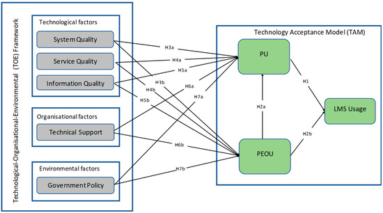 The TOE framework, which was developed by Tornatzky and Fleischer [37], comprises three significant contexts: technology, organisation, and environment. It is widely utilised in quantifying technology adoption. The context of the TOE framework provides reliable empirical support for understanding users’ attitudes towards technology usage [38]. These factors influence the adoption of technology and improve the performance of the organisation [39]. The model uses organisational dimensions such as technology, organisation, and environment, each of which has a specific effect on the organisational capacity to adopt new technology [40]. The dimensions used in this framework provide valuable insights into LMS adoption within the university context. Technology factors are considered as essential factors that will affect technology users, such as system quality, service quality, and information quality [41].