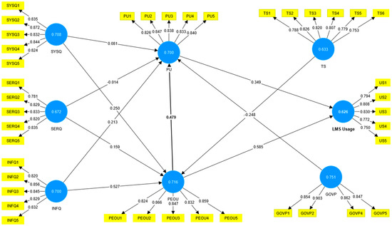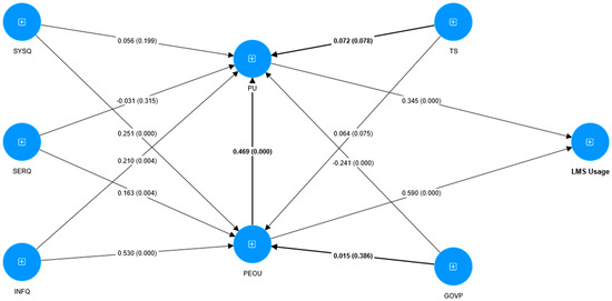Information quality refers to the desirable characteristics of a system’s outputs, such as relevance, accuracy, understanding timeliness, completeness, usability, and accessibility [41]. Many scholars have declared that information quality is regarded as one of the significant determinants of the perceived ease of use and usefulness of information used [50,54]. Previous empirical research has shown that information quality has a positive relationship with perceived usefulness and ease of use [5,24,46,55]. Previous empirical research has shown that information quality has a positive relationship with PU and PEOU [5,24,46,55]. Many scholars have declared that information quality is regarded as one of the major determinants of PU and PEOU [50,54]. Abdallah, Ahlan [52] observed that information quality indirectly influences LMS intention to use LMS via PU and PEOU. Sharma, Gaur [55] confirmed the direct effect of information quality on the LMS adoption, as well as detected PEOU and PU mediating between information quality and LMS acceptance. Therefore, the study hypothesised the following: