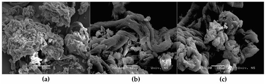 The microstructural characteristics of WFG fibers fat mimetics observed by scanning electron microscopy are presented in Figure 1. Wheat fiber fat mimetics include 70% of colloidal wheat fibers and 30% of maltodextrin. Obviously, the spatial organization of WFG HS73 fibers tends towards a curled (globular) fiber structure (Figure 1a), where between long chains of wheat fibers the small maltodextrin molecules are fitted (Figure 1b,c).