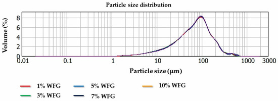 The particle size distribution of the WFG fat mimetic is specific because it does not depend on the wheat fibers’ concentration in the system (Figure 2). The width of particle size distribution of the wheat fiber fat mimetic is uniform (0.72–0.74), and for the observed fibers’ concentration of 1–10%, the value is in the range from 2.23–2.28 (Table 1). Volume weighted mean (D[4,3]) is in a narrow range from 86.60 to 92.31 μm.; a total of 90% of the volume distribution (d (0.9)) is below the value of ~180 μm and the median volume diameter d (0.5) pointed that 50% of the particles’ sizes are in the range from 72.06 to 73.91 μm for all observed wheat fiber fat mimetics. Small particles (d (0.1) ≈ 16 μm) are distributed in the interspace.