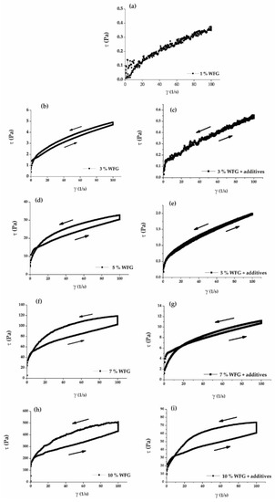 Rheological flow curves of WFG fat mimetics at different fibers concentration (a,b,d,f,h) without additives and (c,e,g,i) with additives. The arrows mark ascending and descending direction of flow curves.