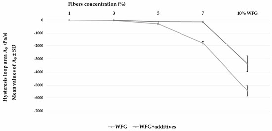 The inclusion of small molecules of additives led to competition between functional groups, and disturbed the wheat fibers’ interaction. Thus, a decrease in the absolute values of the hysteresis loop area was noticed for the fat mimetics with additives compared to the WFG fat mimetics without additives, at the same fiber concentration (Figure 4).