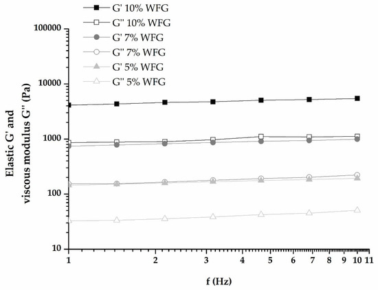 Antithixotropic flow behavior is manifested as a negative value of the area of the hysteresis loop, which indicates that the descending curve is above the ascending curve at the diagram of the dependence of shear stress over shear rates [33]. With the increasing concentration of WFG fibers, the absolute value of the area of the hysteresis loop also increased. This behavior was expected because the higher level of wheat fibers in the system provided more fiber interaction and increased the degree of their networking during gel formation.