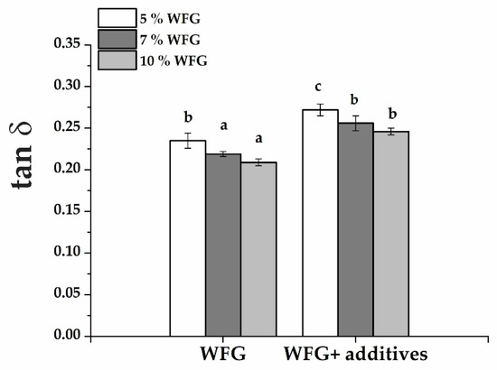 Mean values of tan δ ± SD for wheat fibers fat mimetics with and without additives. Bar’s values with the same letter (a–c) are not significantly different (p > 0.05) according to Duncan’s test.