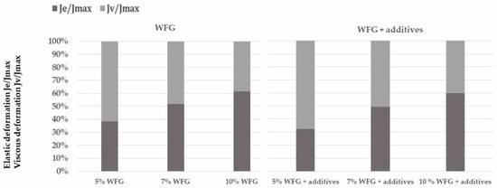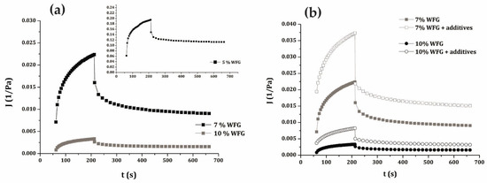 Based on this, observed fat mimetics had some resistance to the applied constant stress and exhibited specific compliance. During the relaxation phase, they showed a significant recovery ability. Figure 7a shows that increased fiber concentration in fat mimetic reduced the compliance of the gel system, pointing to their higher viscosity. The structure of WFG fat mimetics with additives had higher values of compliance compared to the same fiber concentrations; accordingly, they are more susceptible to deformation than WFG fat mimetics without additives (Figure 7b).