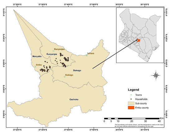 The data for the current study were obtained from mango farmers in the Runyenjes and Manyatta sub-counties of Embu County, Kenya. The county (Figure 1) was purposively selected by the African Fruit Fly Program of icipe as a benchmark project site, since it is one of the leading mango-producing counties in Kenya.