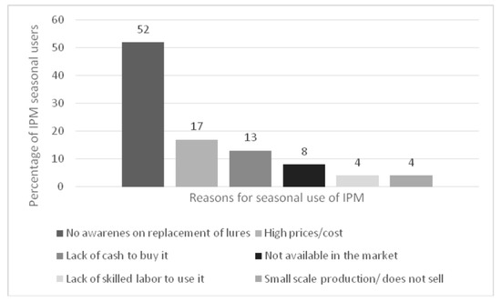 The second classification of IPM users was IPM use by season, where adopters were categorized as either seasonal users or continuous users. A comparison of seasonal and continuous users showed that 71% of IPM adopters were continuous users, while 29% were seasonal users. The main constraint for the seasonal use by IPM users was limited awareness or knowledge on the replacement of the lures, reported by 52% of the seasonal IPM users (Figure 3). Mango farmers also cited a lack of cash to buy and maintain IPM, and the unavailability of IPM to be the second and third reasons, respectively, leading to the seasonal use of the technology.