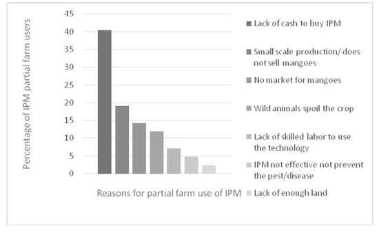 Even when the benefits of technology have been proven, the adoption of most introduced agricultural technologies is often partial, possibly to reduce the uncertainty in performance associated with innovations [32]. A total of 60% of IPM adopters were whole-farm IPM users, while 40% were partial-farm IPM users. A lack of money to buy and service fruit fly traps was cited as the main constraint leading to partial-farm use of the technology (Figure 4). Other constraints cited were the small-scale nature of production, lack of a ready market for the mangoes, crop destruction by wild animals, and a lack of technical support in handling the technology. The perceived non-effectiveness of the IPM reported by a few respondents could be attributed to the incorrect timing of the replacement of the traps, suggesting the need for further training and technical support for enhanced adoption of the technology.