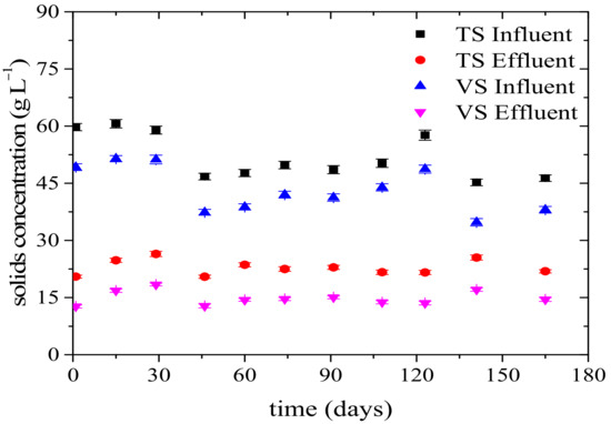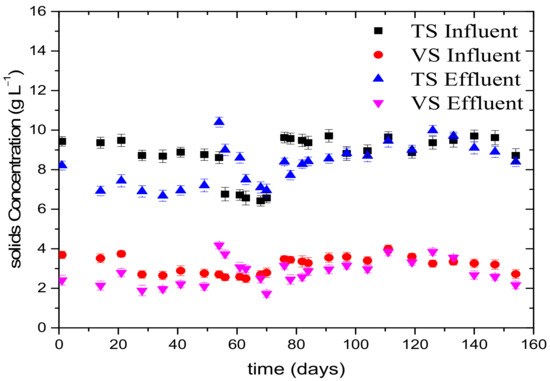 Next, the TS and VS concentrations in the inlet and outlet of the SBR were quantified and the respective results are shown in Figure 6.