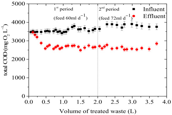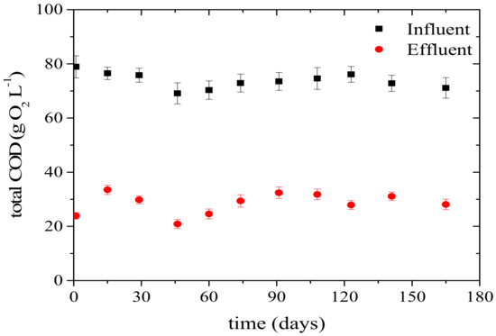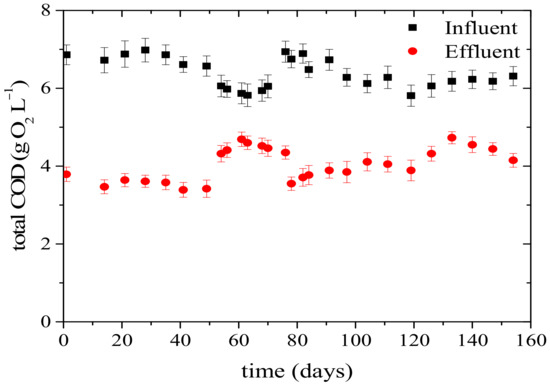 The COD values of the SBR-treated mixture were also found to decrease during the SBR treatment (Figure 7), with a more pronounced decrease during the first days of operation of the SBR, which corresponds to the lower content of TS in the effluent, as already mentioned above. The percentage reduction during the last 80 days of the operational period of the reactor reached ~33.2% ± 5.8.
