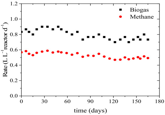 The profile of COD, a parameter that is closely related to the presence of organic compounds that can be oxidized, both at the inlet and outlet of the reactor, can be considered generally stable, while a significant reduction in the COD values after treatment was observed. On average, the percentage reduction during the last operational period of the reactor was found significant, quantified at 59.9% ± 3.1 (for the last experimental period). Accordingly, Figure 4 represents the methane and biogas generation rate during the operational period of the CSTR.