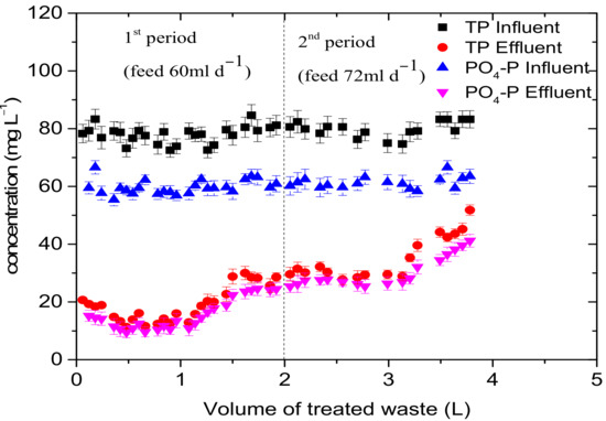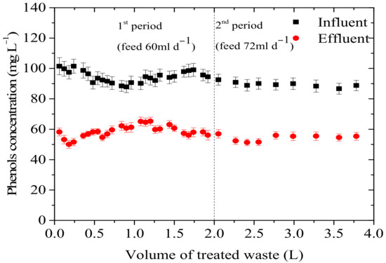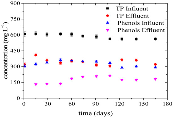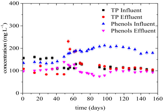 Next, we monitored the concentration of TP and phenols both in the inlet and outlet of the CSTR. The respective results (Figure 5) clearly indicate a significant reduction in the TP concentration after the anaerobic digestion, due to the consumption of phosphorus by the microorganisms towards their metabolic activities.