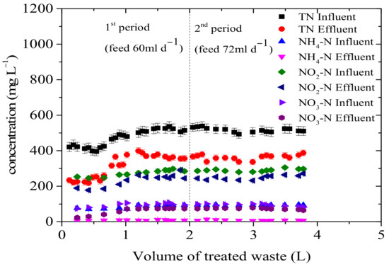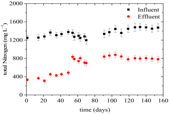 Furthermore, the effect of the oxic–anoxic treatment on the average concentration of the TN was evaluated. As can be seen in Figure 9 for TN, after equilibration of the SBR on day 91, a 44.4% ± 3.3 decrease in the TN concentration was quantified, from ~1428 mgL−1 to ~795 mgL−1, in the influent and the effluent, respectively. Analysis for the determination of the concentration of inorganic forms of nitrogen (ammonium, nitrite and nitrate ) in the last sample of influent and effluent of the SBR process was performed, and the concentration of ammonium nitrogen was found to decrease from 550 to 110 mg L−1,. On the other hand, the concentration of nitrite and nitrate nitrogen increased from 3.9 mg L−1 and 13.9 mg L−1 to 297 mg L−1 and 112 mg L−1, respectively. These results indicate that nitrification and denitrification processes took place in the SBR during this experimental period. In our case, after the 70th day, a decrease in the nitrogen reduction rate was observed, which can be attributed to the biomass that was attached to the walls. This comes in agreement with the total solids concentration profile as demonstrated in Figure 7, in which after the 70th day influent and effluent were in equilibrium; therefore, no more biomass was further attached. On the contrary, in the first experimental period (until the 70th day) solids in the effluent were found less than in the influent, so more biomass was active until the biofilm was formed, which resulted in the deactivation of the inner layers. As far as nitrification is concerned, it is clear that a not complete conversion of ammonium nitrogen to NOx took place, which can be associated with an inhibition of ammonium and nitrite oxidizing bacteria. Svehla et al. reported a gradual increase in nitrite nitrogen concentration, which was accompanied by a decrease in nitrate nitrogen in a CSTR-treating liquid phase of digestate from an agricultural biogas plant, using pig slurry and grass silage. This behavior was attributed to the value of pH in the reactor which was not controlled and decreased throughout the experiment. Moreover, they performed the same experiment while controlling the pH (to the value of 7.0) and, in this case, the researchers did not observe any accumulation of nitrite nitrogen, a phenomenon that practically promotes the conversion of total ammonia nitrogen to nitrate [29].