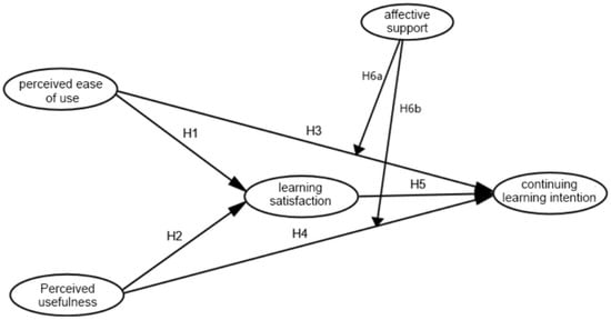 Although a considerable body of previous studies has focused on the perceived ease of use and perceived usefulness, and satisfaction with online learning in the framework of the Technology Acceptance Model (TAM) and Expectation–Confirmation Model (ECM) [7,13,14,15,16,17], the authors find a lack of studies investigating the influencing mechanism of the interaction between these variables and the continuing learning intention moderated by affective support [18,19,20]. In addition, studies with online cohorts of lifelong learners in higher education via distance learning are scarce. Although blended learning has been advocated for the new normal post-COVID-19, the online learning mode provides a new pathway for learners to pursue further education and upgrade their qualifications, and the question of how to enhance the willingness of this cohort to continue learning is still an important issue that needs to be addressed in the context of distance learning. In particular, the impact of the COVID-19 pandemic has brought to the fore the psychological problems of adults in the learning process, and affective support may be an important measure to enhance their continuing learning intention, to retain the learners and reduce the risk of drop-out in online learning.