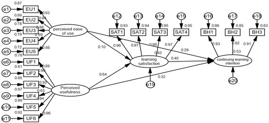 On the basis of the research hypotheses, maximum likelihood estimation was used to test a structural equation model constructed with perceived ease of use and perceived usefulness of the online learning platform as independent variables, the continuing learning intention as the dependent variable, learning satisfaction as the mediating variable, affective support as the moderating variable, and controlling for background variables such as gender, age, location, and online course attributes. As indicated by Hair et al., the model was first estimated for basic fit [55]. The results indicated that all error variances were positive, and the decisive values of the error variances varied from 9.661 to 14.170, all achieving a significant level of 0.001 or more, so satisfying the criteria of having no negative values and reaching a significant level. The standard errors of the parameters ranged from 0.002 to 0.043, and none were statistically significant. The factor loadings between the potential variables and their respective measures were all greater than the suggested value of 0.6 [56]; thus, the test findings revealed that the measurement model’s basic fit was adequate.
