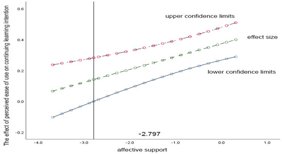 To further quantify the test results of the moderation effect, the Jonson–Neyman technique was used to investigate the boundary value of the moderation effect of affective support [62], thereby determining the level at which the moderator variable exerted a significant moderation effect. In this study, the influence of learners’ perceived ease of use and perceived usefulness on the continuing learning intention was specifically assessed when teacher affective support exhibited various effect values during online learning, and the statistically significant interval of the associated moderating effect was determined. As depicted in Figure 3, when the standardised value of the teacher’s affective support was greater than −2797, the moderating variable had a significant positive moderation effect (the confidence interval did not contain 0); when the standardized value of affective support was less than −2797, the moderator effect did not exist. It can be seen that the greater the instructors’ affective support during the online learning process, the greater the learner’s perceived ease of use of the learning platform, which can promote the continuing learning intention more effectively. Figure 4 demonstrates that when the standardised value of the teacher’s affective support is greater than −2.841, the positive moderation impact is substantial (the confidence interval does not contain 0), whereas when it is less than −2.841, the moderation effect is not significant. The analysis demonstrates that when a teacher’s affective support is at a medium or higher level, the increased perceived usefulness resulting from the support effect can greatly improve learners’ continuing learning intention.